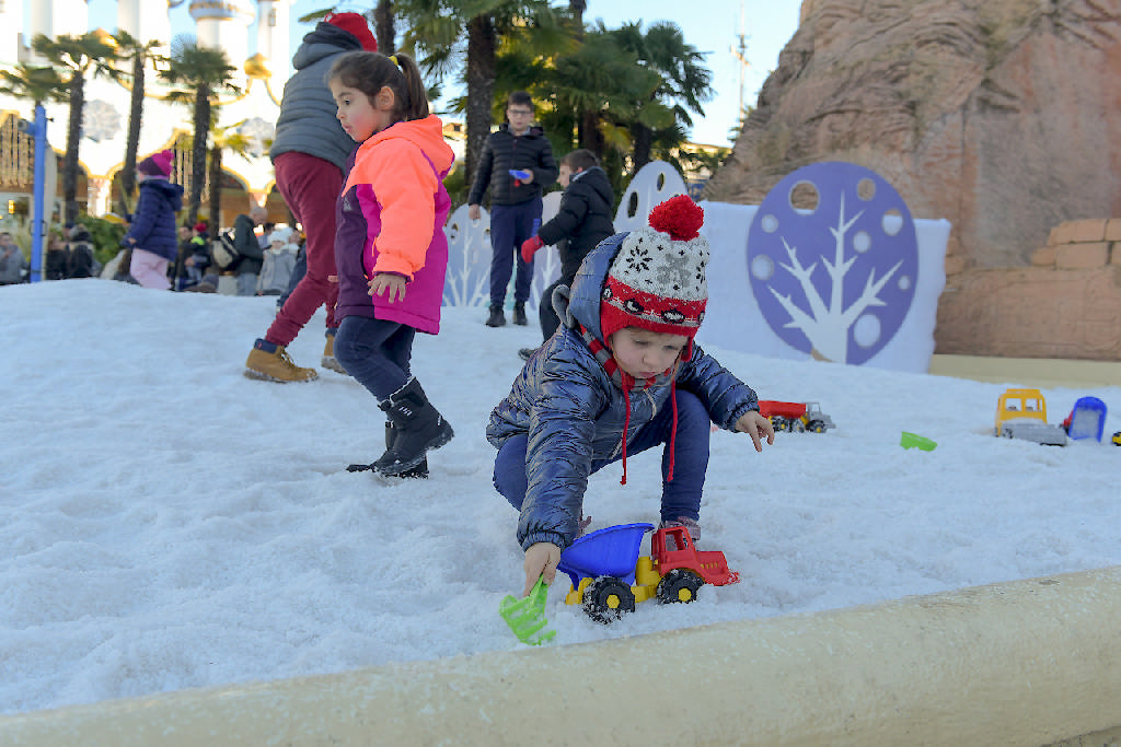 La atracción consiste en un tobogán en espiral al cual se accede por escaleras dispuestas en una estructura metálica que desembarcan en el inicio del tobogán, el cual esta recubierto de hielo, se dispone de trineos hinchables donde sube el participante y se desliza hasta caer a la piscina inferior con nieve en su interior para frenar la caida.